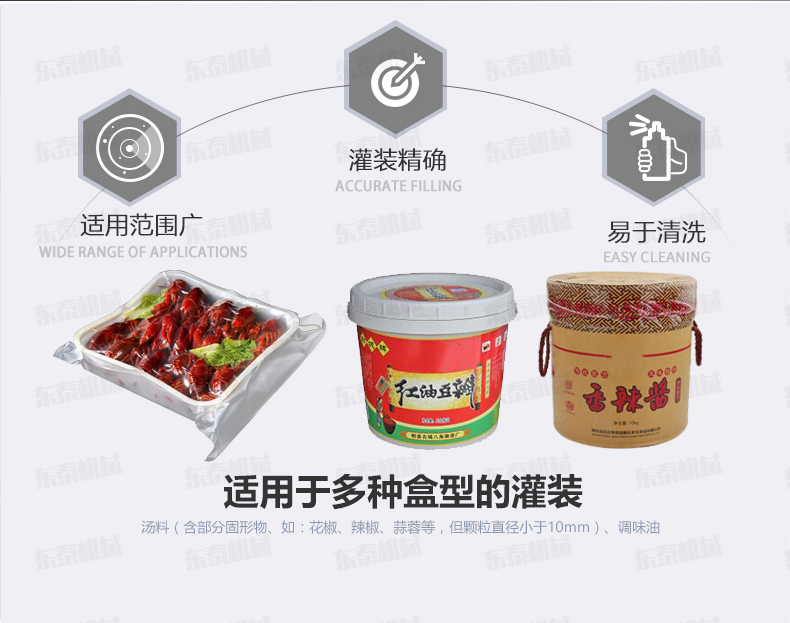 1.灌裝機在參考國外同類產品的基礎上進行改良設計,特制湯料、調味油灌裝頭,機械防滴漏保護,在灌裝過程中不會污染包裝容器。