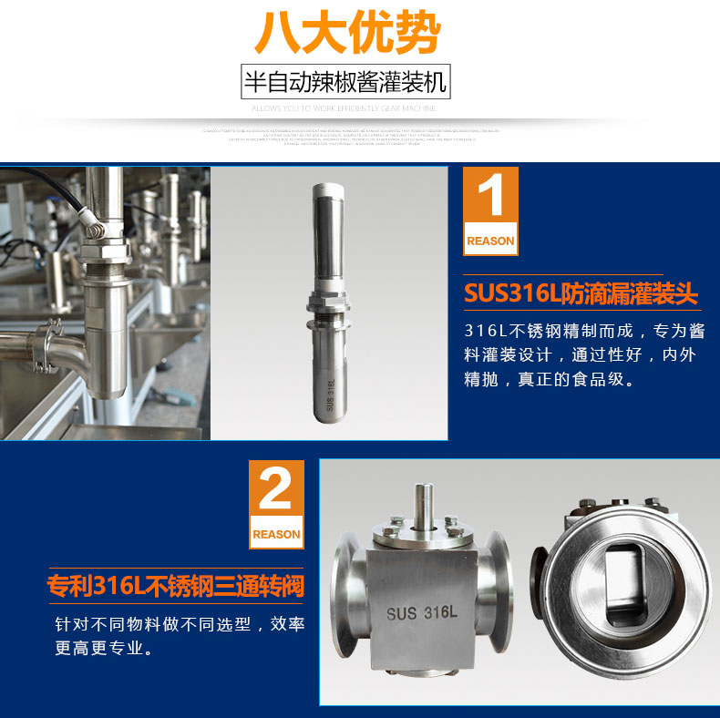 產(chǎn)品簡介:半自動(dòng)醬類醬料灌裝機(jī)SFM系列結(jié)構(gòu)合理、機(jī)型小巧、性能可靠、定量準(zhǔn)確、操作方便。整機(jī)304不銹鋼,灌裝悶頭防漏料防滴油,氣缸驅(qū)動(dòng)結(jié)構(gòu),加大200L料斗,品牌全鋁殼銅芯大功率攪拌電機(jī),變頻調(diào)速,PLC智能控制,用戶可根據(jù)需要任意調(diào)節(jié)灌裝量及灌裝速度,灌裝精度高。