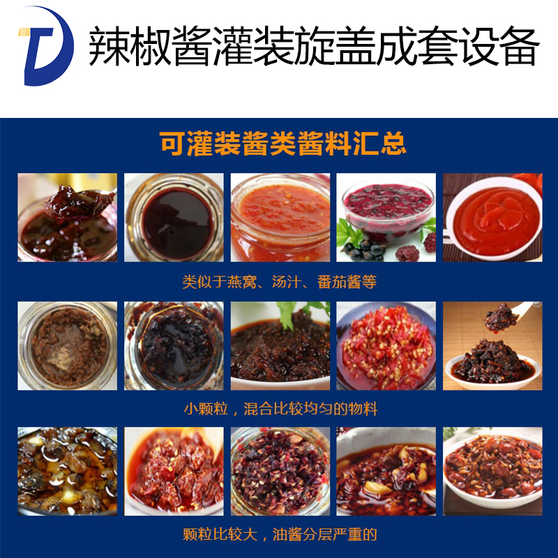 3、  辣椒醬灌裝機在設計上大大縮短了下料斗到灌裝頭的灌裝距離,克服了含油量大的物料(如:含芝麻粒的辣椒油)辣椒醬灌裝機在灌裝過程中出現的有些瓶油多,有些瓶醬多的灌裝誤差大的缺點。